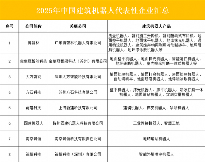 2025年中国建筑机器人行业代表性企业汇总如下(注:排名不分先后):