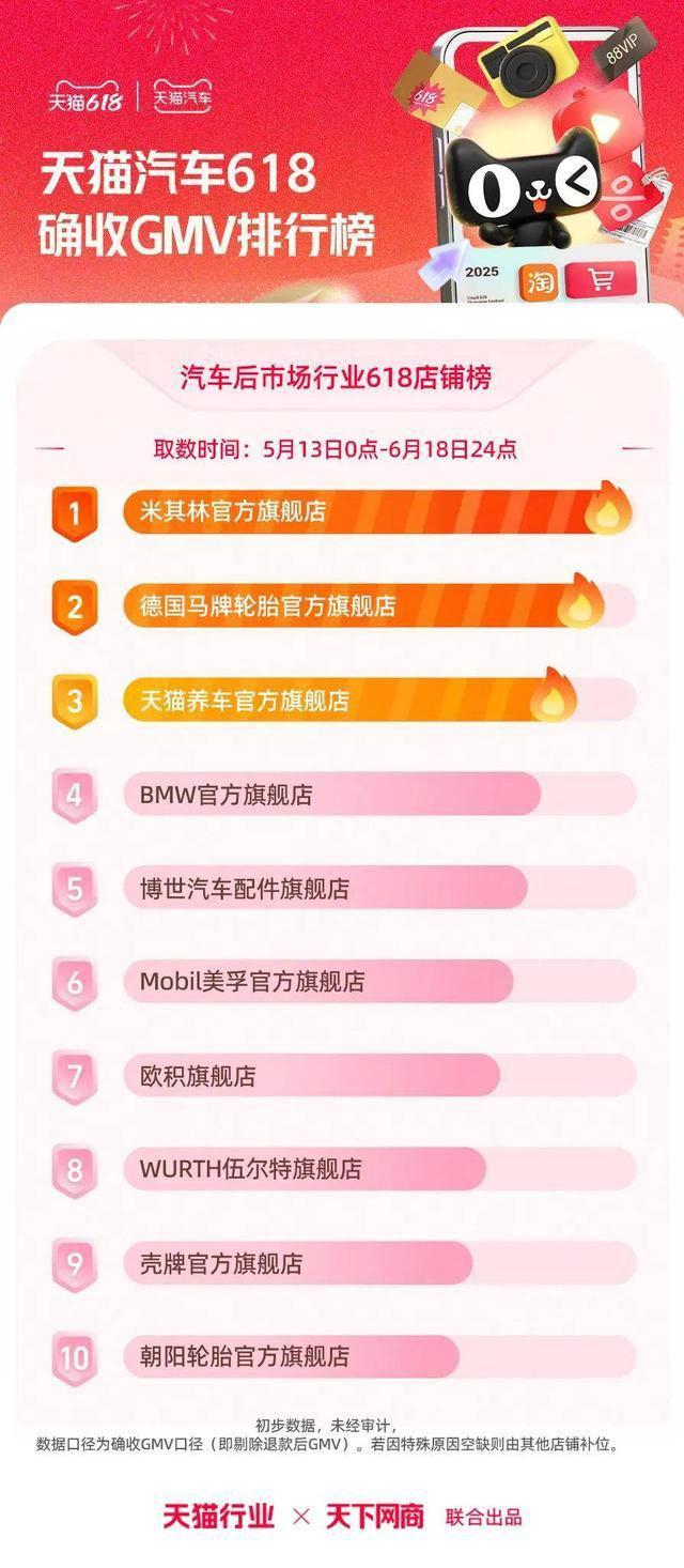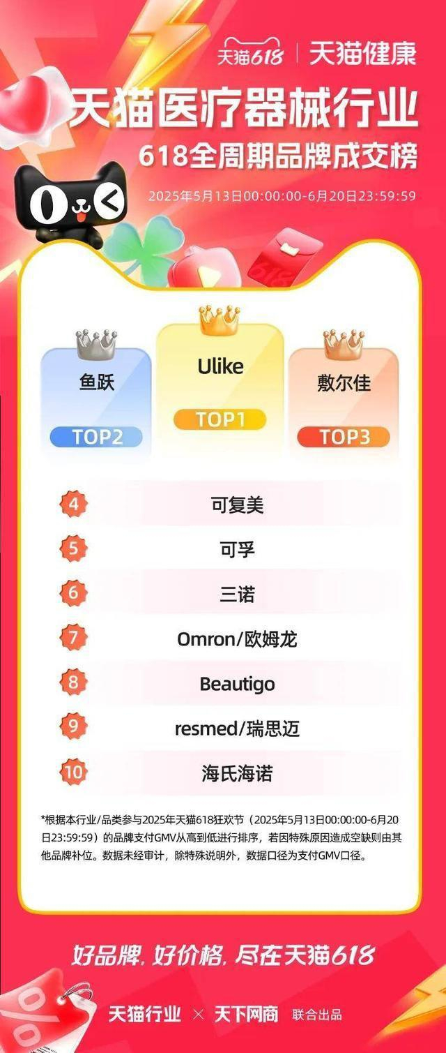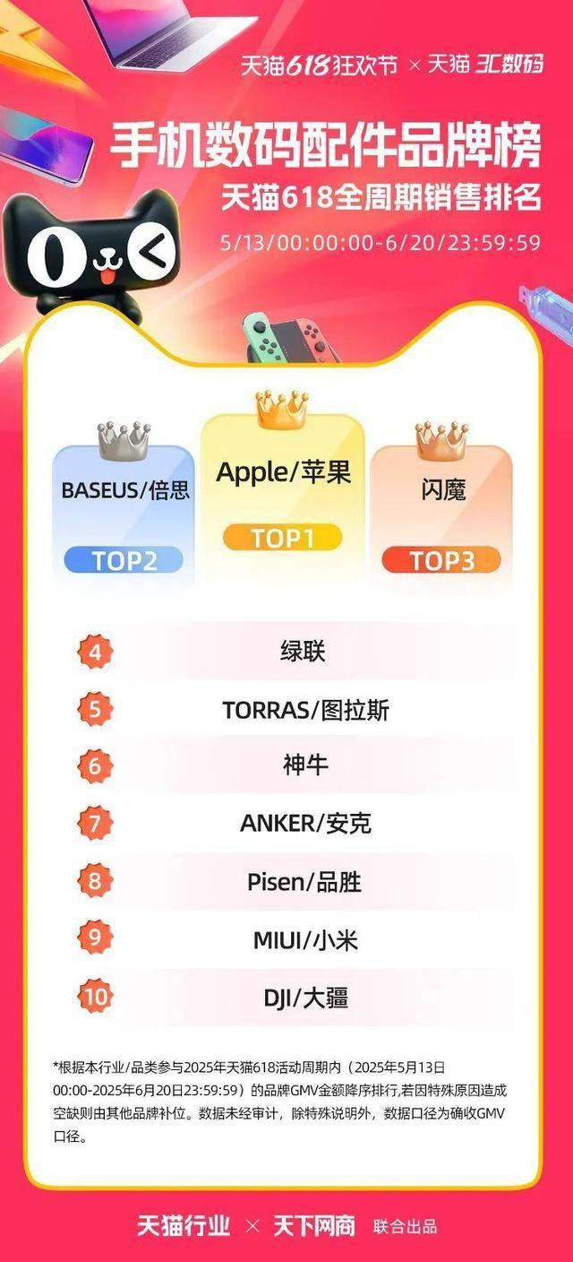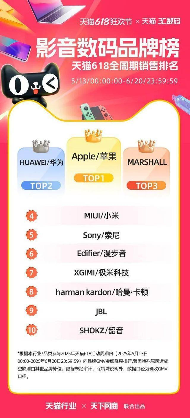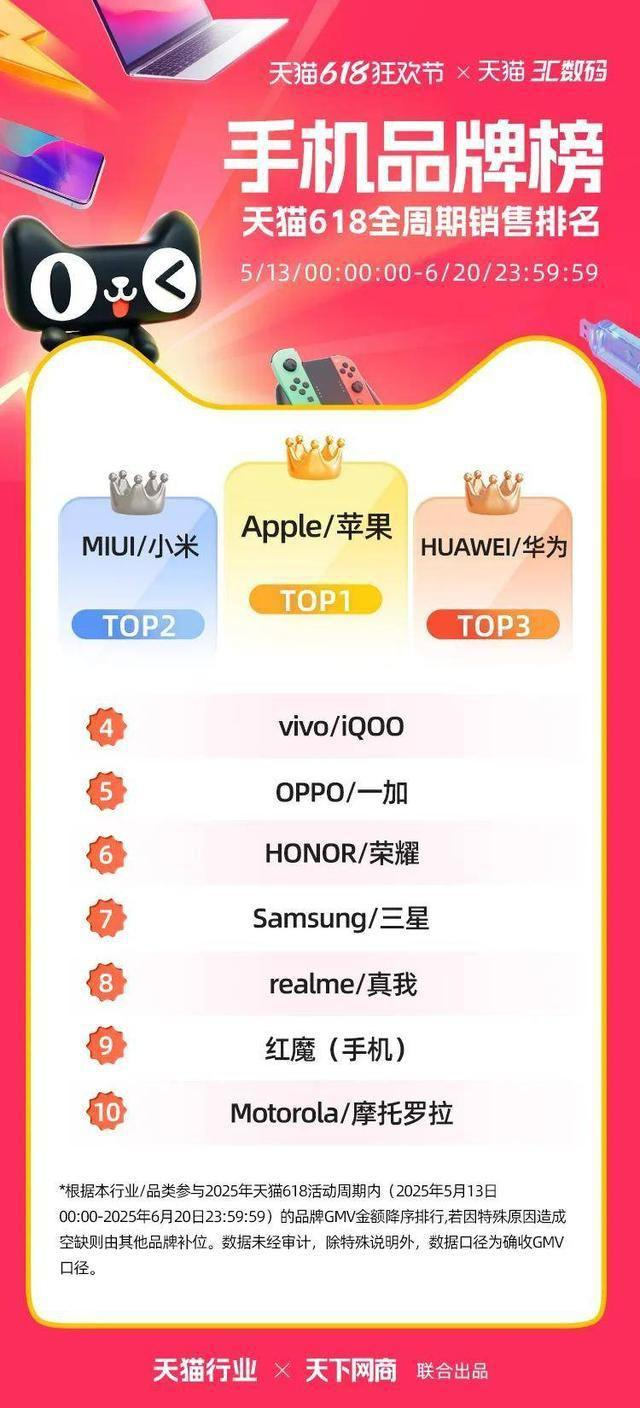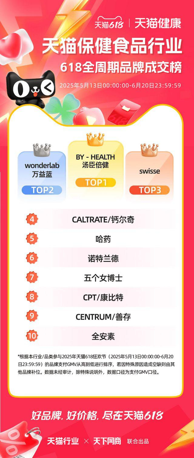 6 月 22 日,2025 年天猫 618 全周期品牌成交排行榜出炉,快消、服饰、运动户外、家电家装家居、3C 数码、玩具潮玩、香氛香薰、宠物、食品生鲜、汽车、健康、图书、教育、企业服务、珠宝饰品、天猫国际等行业的领跑品牌、商家出炉。