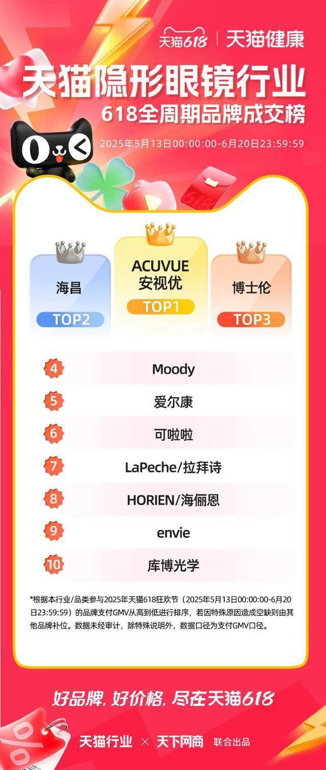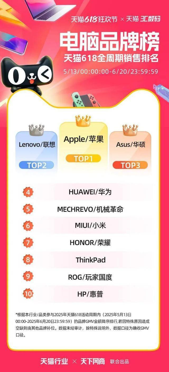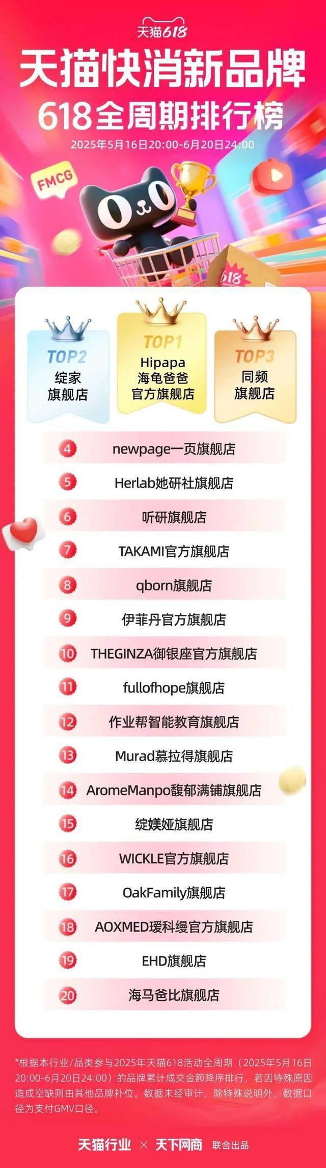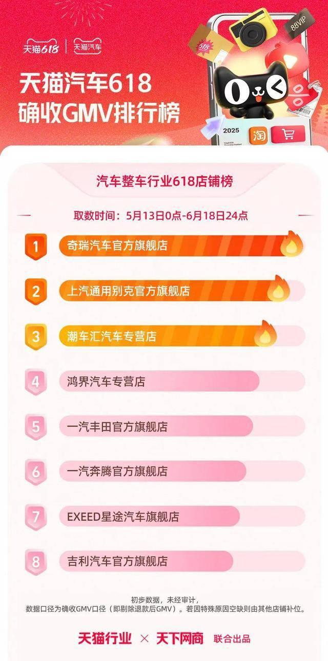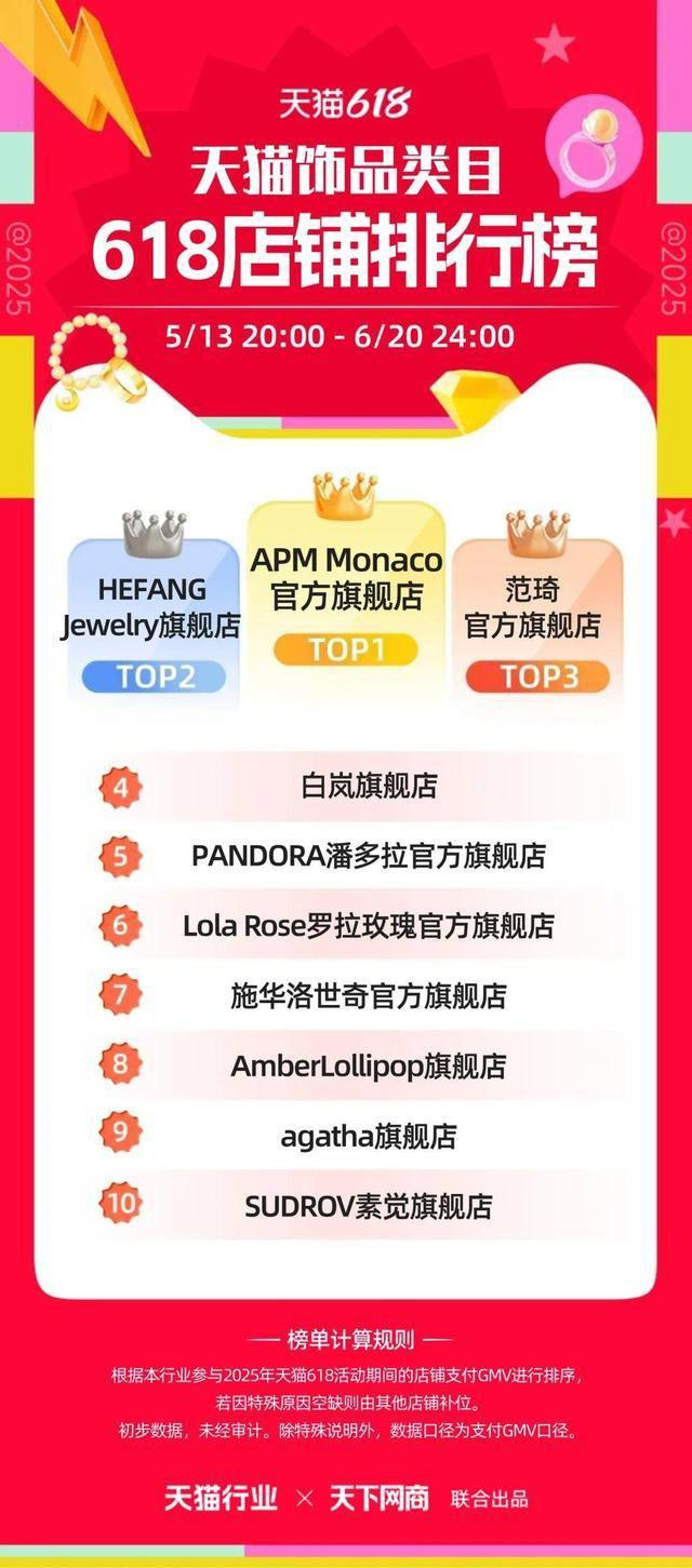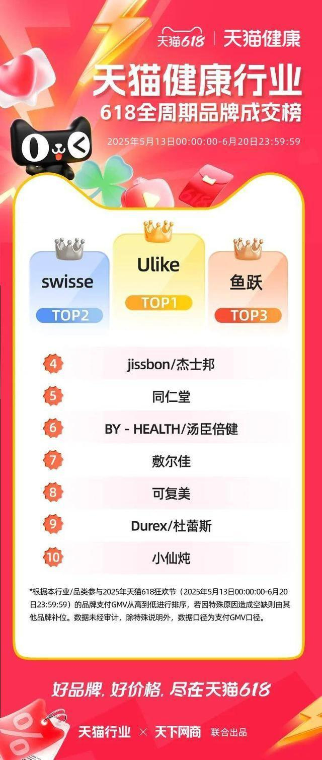 6 月 22 日,2025 年天猫 618 全周期品牌成交排行榜出炉,快消、服饰、运动户外、家电家装家居、3C 数码、玩具潮玩、香氛香薰、宠物、食品生鲜、汽车、健康、图书、教育、企业服务、珠宝饰品、天猫国际等行业的领跑品牌、商家出炉。