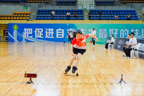 轮滑项目中,自由式双鱼速度过桩的选手们在 12 个间距 1.2 米的桩间穿梭,以灵活的身姿完成 “S” 形绕桩动作,每一次加速与转向都洋溢着青春的灵动。