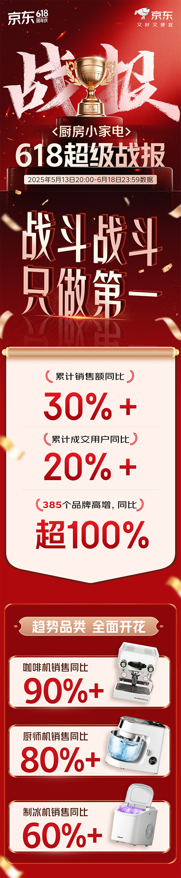 2025年京东618圆满收官!京东家电家居凭借“又便宜又好”的核心购物体验,实现了全面突破。其中,京东通过厨房场景整合营销,成功激发了消费者一站式购买的需求,实现厨电品类、厨具品类的销售增长。京东数据显示,自5月13日心动购物季至6月18日期间,厨电品类累计销售额同比增长超过30%,累计成交用户同比增长超过20%,共有385个品牌实现了高速增长,同比增长超过100%,刷新历史纪录。5月30日至6月18日,厨具全品类共有超过1400个品牌实现下单用户数的倍增,其中高潮期28小时成交额同比增长超过35%,厨具京喜自营订单在全时期内实现了2000万单的销售业绩。