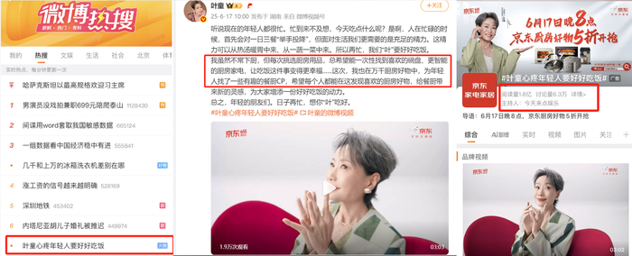 通过深度洞察年轻群体生活痛点,叶童亲自撰写走心长文诠释厨房好物价值,相关话题斩获超1.8亿阅读量,超越同期所有非平台热搜。更联动京东MALL大屏资源,零成本实现超4000万话题阅读量,#京东×叶童#话题跻身微博“星品影响力”TOP5,表现优于白鹿、吴磊等当红艺人。