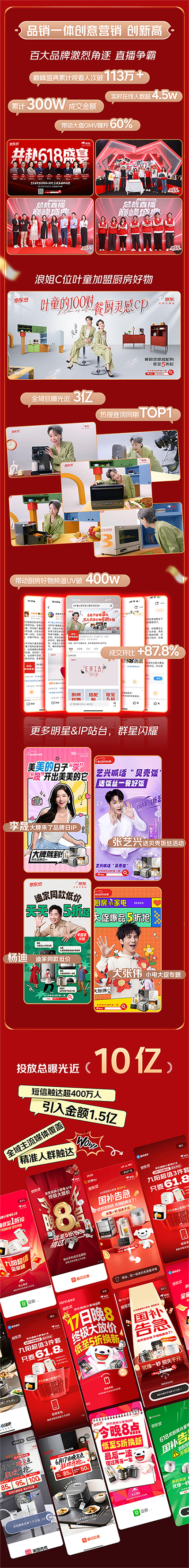 618期间,京东家电家居还集结了李晟、张艺兴、杨迪、大张伟等顶流明星,打造多维度明星营销矩阵:李晟品牌日IP、张艺兴“送贝壳饭丝”活动、杨迪“迪家同款”低价专场、大张伟小电大促专题等,形成强大的明星协同效应,全域营销成效显著。其中,厨具5折活动曝光量超5亿次,小红书相关话题阅读量突破千万,产出爆文170篇。整体投放总曝光近10亿次,精准短信触达超400万人,直接引入金额达1.5亿,成功实现全域媒体覆盖与精准人群触达,将厨房好物打造为年度爆款品类。