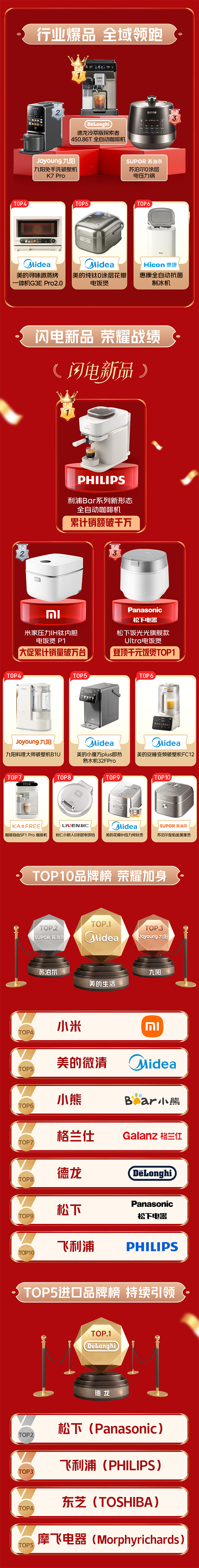 厨房小家电满足现代消费者对精致生活的美好想象。618全周期,咖啡机、厨师机、制冰机等趋势品类表现抢眼,同比增速分别高达90%、80%和60%。德龙、九阳、苏泊尔等品牌强势崛起。其中,德龙冷萃版探索者450.86T全自动咖啡机凭借卓越性能成为行业爆款,领跑全渠道销售。新品方面同样表现卓越,米家压力IH钛内胆电饭煲P1大促销量超万台,松下饭光光旗舰款Ultra电饭煲一举登顶千元价位段销量榜首,展现出强劲的市场竞争力。