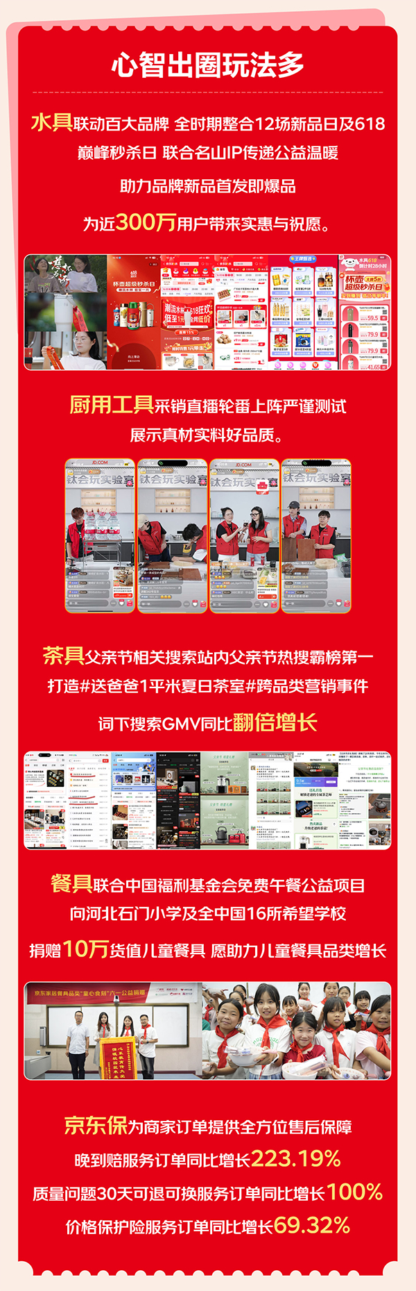 此外,618期间,京东水具品类携手百大品牌,整合12场新品日及618巅峰秒杀日,并联合名山IP传递公益温暖,实现新品首发即爆款的亮眼成绩,惠及近300万消费者,让优惠与温暖同行。茶具品类借势父亲节营销,打造#送爸爸1平米夏日茶室#跨品类营销事件,该话题强势占据站内热搜榜首,带动相关搜索GMV实现同比翻倍增长,让茶具成为父亲节送礼新风尚。餐具品类则联合中国福利基金会免费午餐公益项目,向河北石门小学及全中国16所希望学校,捐赠价值10万元的儿童餐具,助力儿童餐具品类增长。
