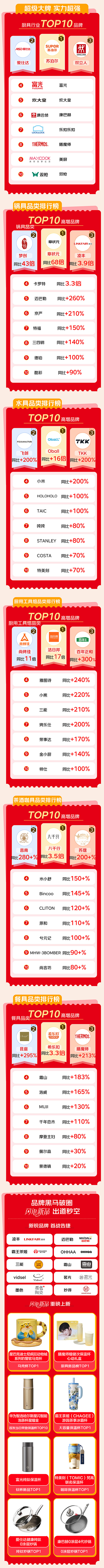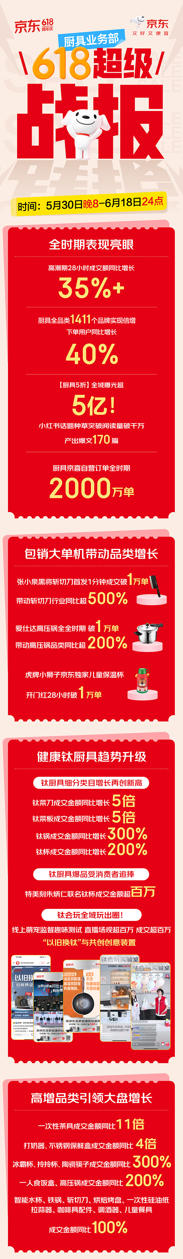 厨具也增长强劲。其中,包销大单机带动品类增长,张小泉黑将斩切刀首发1分钟成交破万单,带动斩切刀行业同比增长超500%;爱仕达高压锅618周期销量突破1万单,推动高压锅品类同比增长超200%;虎牌小狮子京东独家儿童保温杯,开门红28小时内销量破万单。618期间,健康钛厨具趋势升级,钛菜刀、钛菜板成交额同比增长均达5倍,钛锅成交额同比增长300%,钛杯成交额同比增长200%。钛厨具爆品受消费者热捧,特美刻朱炳仁联名钛杯成交额超百万。
