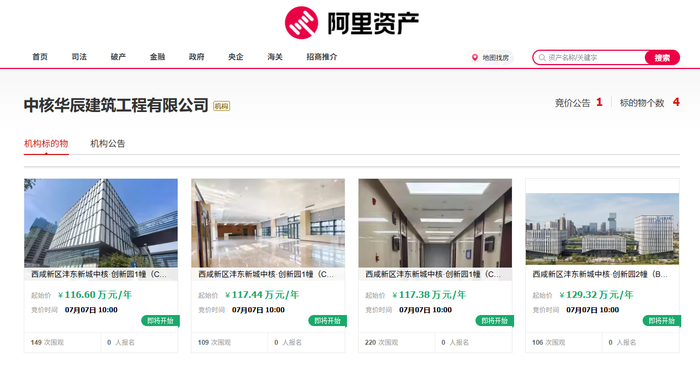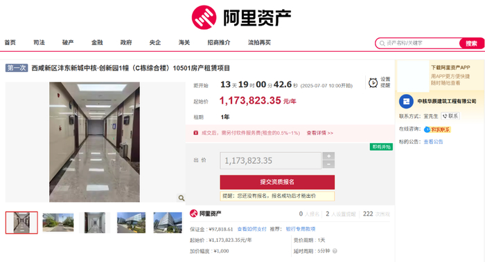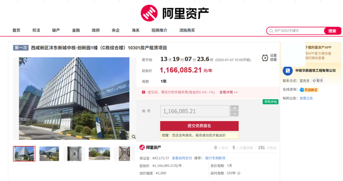 中核华辰建筑工程有限公司于2025年06月16日15时起至2025年07月06日15时止(延时的除外)在阿里资产平台对陕西省西安市西咸新区沣东新城中核·创新园部分房屋一年使用权出租项目进行公开挂牌出租。
