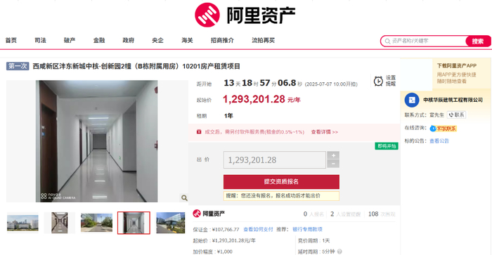 本次专场的第二个标的是西咸新区沣东新城中核·创新园1幢(C栋综合楼)10401房产租赁项目。