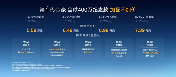 同时,为感恩回馈用户支持,即日起至7月31日期间,购买第4代帝豪全球400万纪念款的用户,除了1000元抵14000元购车金的权益之外,还可享受四大感恩权益,包括:价值2000元墨黛蓝和流光紫限定车色限时免费赠送、至高4000元置换补贴、终身免费基础流量以及4年或15万公里整车质保。