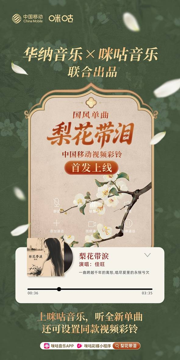 9月19日,咪咕音乐与华纳音乐首次联合出品的国风单曲《梨花带泪》在咪咕音乐、中国移动视频彩铃首发上线。该作品由马来西亚唱作人佳旺演唱,以现代音乐语言重新诠释白居易《长恨歌》中“梨花一枝春带雨”的古典意境。