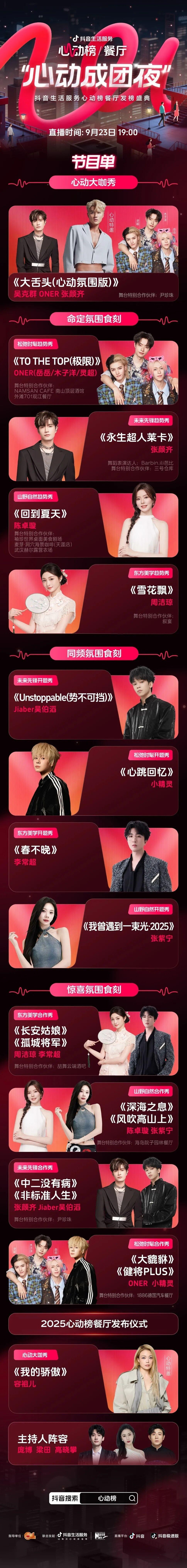 “心动成团夜”节目划重点!晚会主题曲《大舌头(心动氛围版)》完整版首秀;三大“氛围食刻”、12场主题大秀轮番上演,带你沉浸切换在东方美学、山野自然、松弛时髦、未来先锋四大氛围趋势之间;更有重磅环节——2025心动榜餐厅发布仪式,共同见证101城心动榜餐厅“成团”~