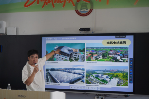 广西灌阳县西山瑶族乡民族学校的智慧教室,是此次活动的主会场。启动仪式上,阳光新能源、中国社会福利基金会代表与校方共同为教室揭牌,崭新的互动大屏、齐全的乐器让孩子们眼中满是期待。揭牌后,“村长” 李锐以 “从出行看人类能源利用的演变” 为主题开讲,通过大屏与全国十校师生实时连线,让科普课堂实现“一键跨屏共享”。“我们是怎样飞起来的?”李锐以孩子熟悉的问题切入,结合动画图片与生活场景拆解能源原理:“屏幕里转动的风车,靠风就能发电;屋顶上的蓝色板子,能把太阳光变成电。”抽象的知识变成生动“小故事”,一颗颗科学探索的种子在跨区域讲授中生根发芽。
