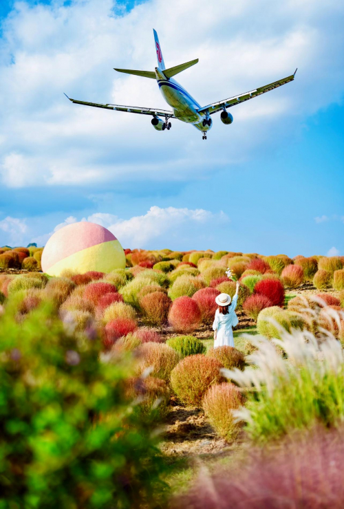 要说这个国庆空港花田的“王牌”,当属这片云端下的浪漫花海!花海区被粉黛乱子草、地肤草、火焰狼尾草承包,随手一拍都是“电影级”大片!