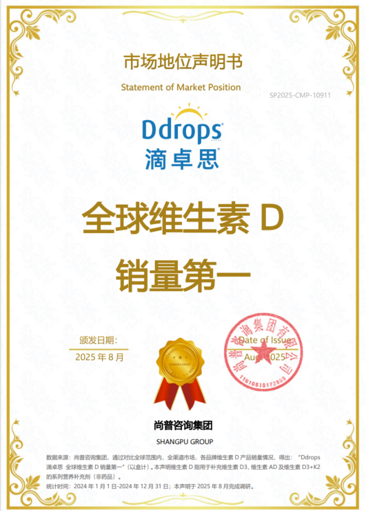 2025年8月,尚普咨询集团向Ddrops滴卓思颁发市场地位声明书。此次Ddrops滴卓思荣获尚普咨询【Ddrops滴卓思 全球维生素D销量第一】市场地位声明,标志着Ddrops滴卓思在维生素D行业中的领导地位及市场的高度认可。