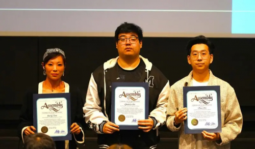 右起:美国领创商业联盟主席胡超、副主席金千旭及创意总监杲航现场领取加州众议院嘉奖证书