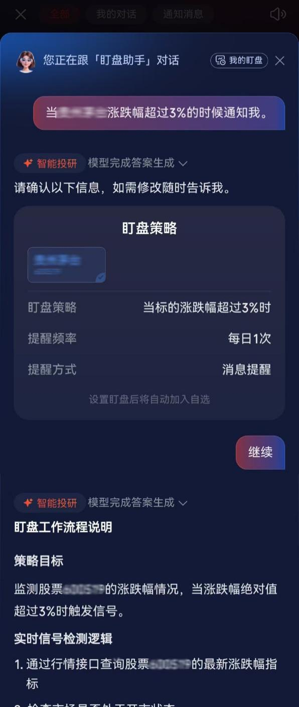 你也不用纠结“何时买”,AI助手会基于你事先设定的指标和条件帮你盯盘,实时监测市场信息,有变化立刻提醒你,关键节点和异动信号也都自动帮你总结好。