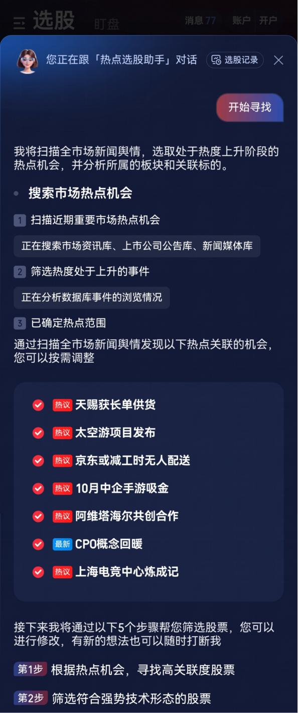 针对用户不清楚“买什么”的需求,“AI涨乐”提供热点、连板、主题、资金四大维度的选股工具,尽力满足各类投资者。比如,你可以直接问“今天有什么热点股?” ,AI助手通过扫描全市场新闻、舆情和公告,利用好大模型的分析能力,做到智能捕捉热点,并挖掘关联板块。