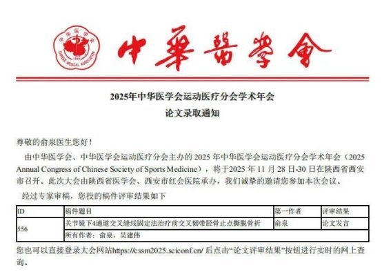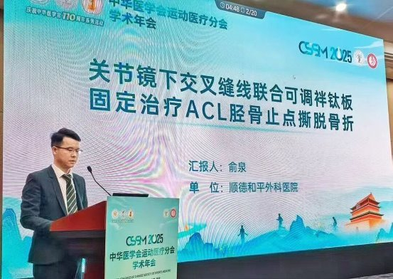会上,俞泉副主任医师作题为《关节镜下交叉缝线联合可调袢钛板固定治疗ACL胫骨止点撕脱骨折》的论文发言。其汇报内容聚焦前交叉韧带胫骨止点骨折的微创治疗新术式,通过详实的数据与案例,展示了该技术在提高稳定性、促进早期康复方面的优势,受到与会专家的广泛关注与好评。