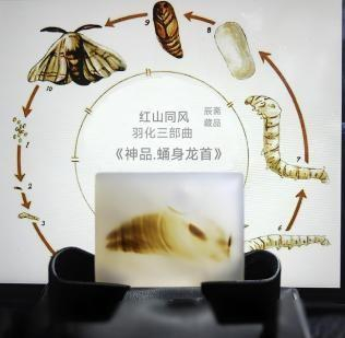 奇石引人遐思的背后是跨界的追寻与对宇宙的无限向往,所以不论蛾与龙、兽亦或是人 ,给我们的是不尽的关于生命的启迪,因蛹身龙首神秘的契合了几千年的中华文明,这次展会《化茧成蝶》、《蛹身龙首》、《蚕宝宝》没有三牌同展。