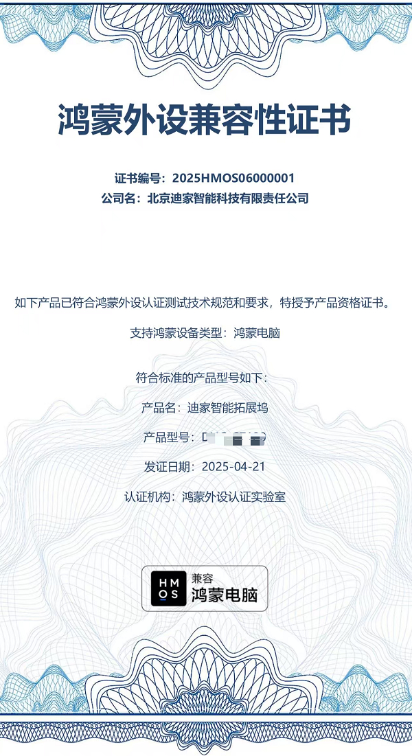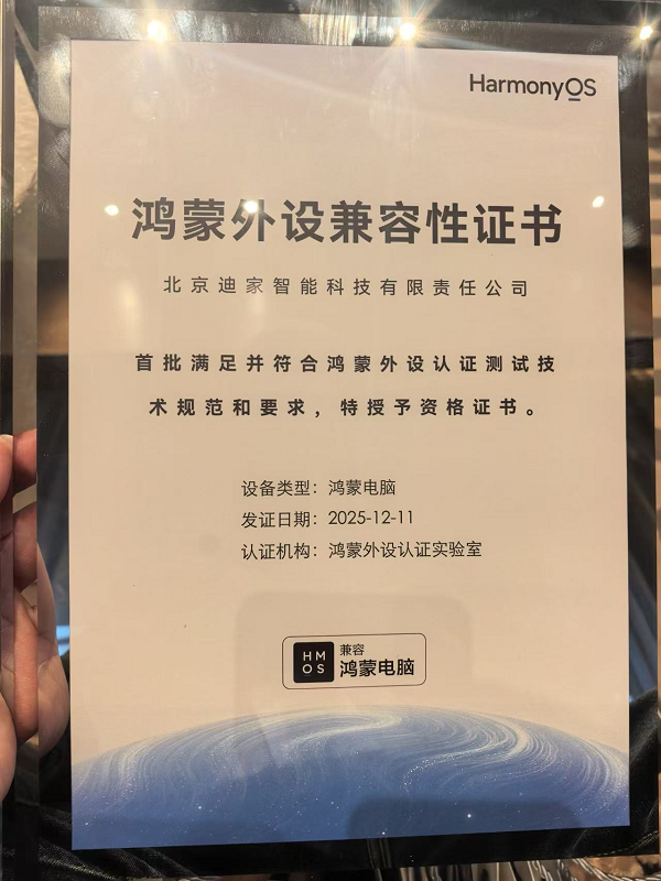 作为迪信通科技集团(06188.HK)旗下核心子公司,迪家智能自 2017 年成立以来便深耕智能终端领域,此次与华为的深度绑定,更是站在了鸿蒙生态扩张的战略风口。依托华为提供的 HarmonyOS 生态核心技术支持与全流程开发工具链赋能,迪家智能以二十余年行业技术积累为基石,构建了完整的外设生态支撑体系与标准化 API 接口,不仅大幅降低了行业外设适配门槛,更凭借过硬的技术实力拿下首批鸿蒙外设兼容性认证及 001 号产品认证证书 。
