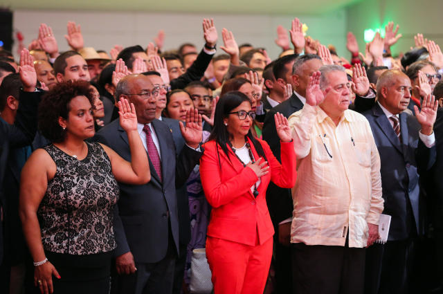 2017年8月4日,在委内瑞拉加拉加斯,委内瑞拉制宪大会成员在仪式上宣誓。(新华社发)同日,委内瑞拉制宪大会举行全会,通过谴责美国武力威胁委内瑞拉的决议,以及将地方选举提前至10月举行的决议。决议说,地方选举应于去年年底举行,但由于反对派的持续暴力行为扰乱正常选举秩序,选举被推迟至今年12月举行。制宪大会选举和平举行后,提前举行地方选举有利于通过透明公开的投票来弥合国内分歧。
