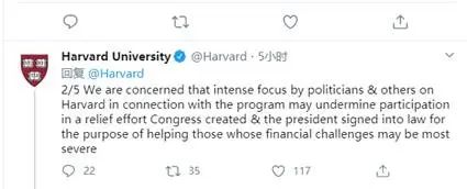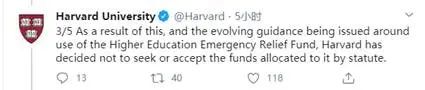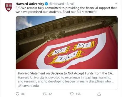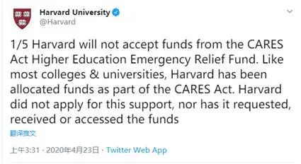 “哈佛大学不会接受‘新冠病毒援助救济和经济安全法案高等教育紧急救济基金’(CARES Act Higher Education EmergencyRelief Fund)的资助。与大多数高校一样,哈佛大学也根据‘新冠病毒援助救济和经济安全法案’(CARES Act)获得了拨款。哈佛没有申请该项援助,也没有要求、接收或使用这笔资金。” ↓