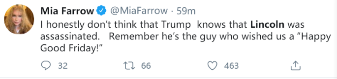 其中一位被点赞和转发较多的美国网友则写道:“我真的不认为特朗普知道林肯是被暗杀的。记住,他是那个祝我们‘耶稣受难日快乐’的人!”