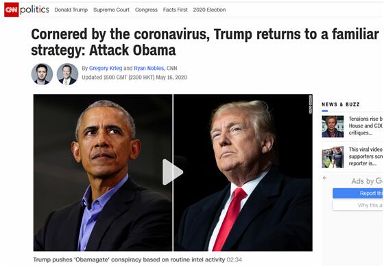 在这篇题为“被新冠病毒逼得走投无路,特朗普重回熟悉策略——攻击奥巴马”的文章中,CNN提到,特朗普给奥巴马安的“罪名”即是“奥巴马门”(Obamagate)。