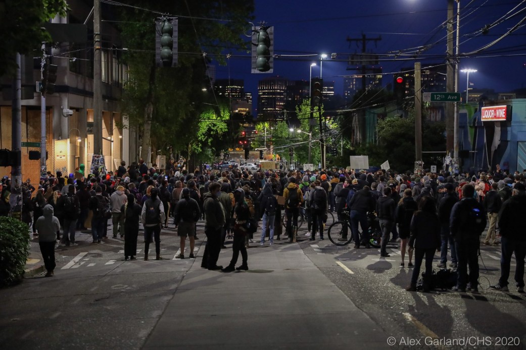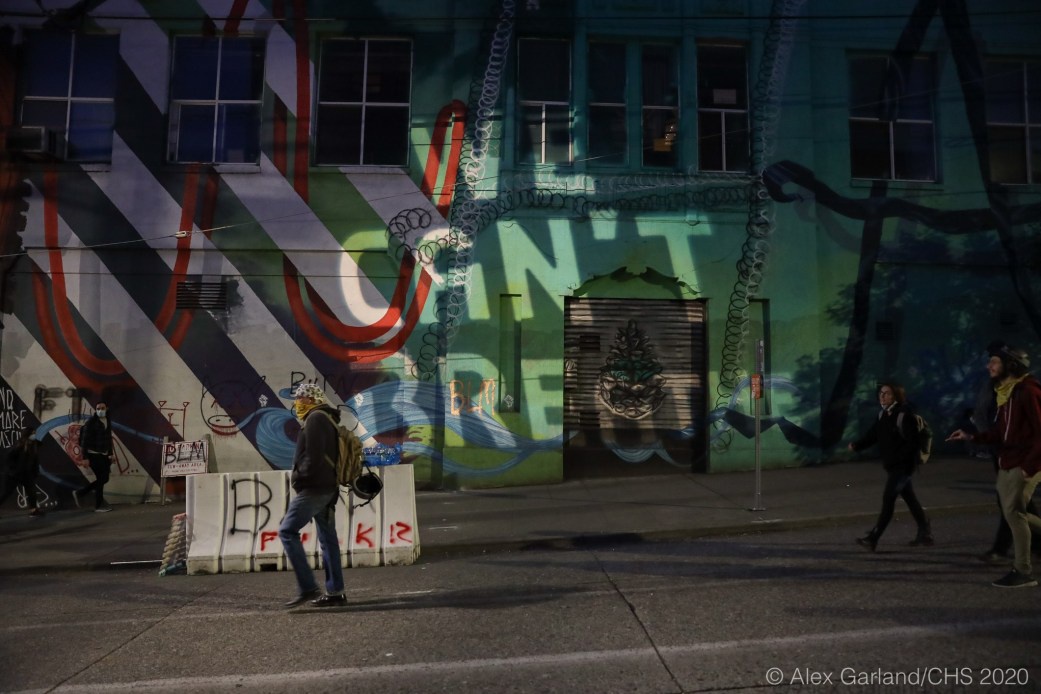 据《西雅图时报》最新消息,9日深夜,示威者们已从市政厅返回国会山区的“自治区”内,其中一些组织起了“露天夜场电影”。