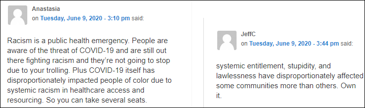 (上3图自推特)在国会山区社区新闻站上,有网民留言评论称,“种族歧视(游行)是一个公共卫生紧急事件。人们知道新冠肺炎的存在,但还在外面反对种族歧视。”