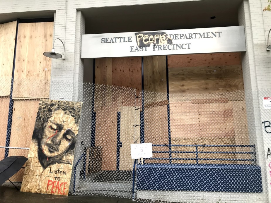 示威者将警察局招牌上“警察”二字涂成“人民”,成为“西雅图人民局东部分局”,一旁还摆上名为《倾听和平》的画作。