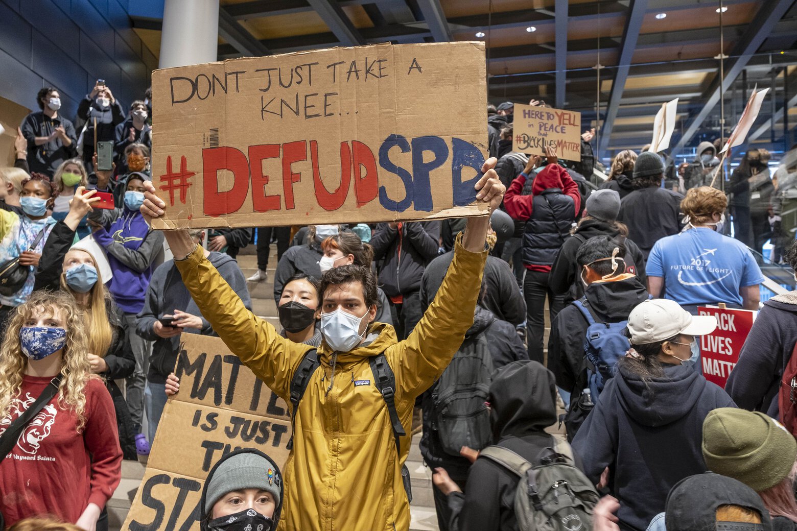 示威者们将市政厅塞得满满当当,时而提出自己的诉求。例如“削减西雅图警察经费”,还有“对亚马逊收税”等。有演讲者发表讲话称,“我们正在这幢建筑中创造历史。”