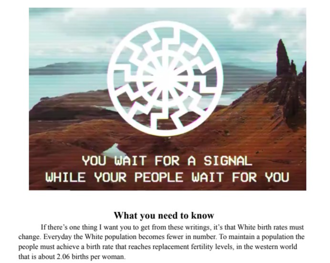 图为此次在美国屠杀黑人的根德伦佩戴象征新纳粹主义的黑太阳徽记,以及使用该徽记做自己的行动计划书封面