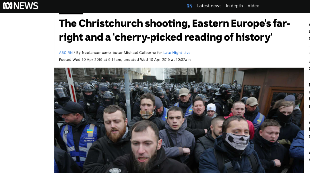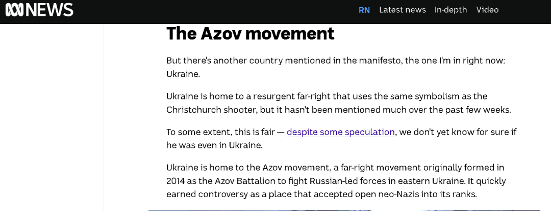 图为乌克兰“亚速营”使用的“黑太阳”等新纳粹极端主义徽记此前,在2019年新西兰那场恐怖袭击发生后,澳大利亚准官办媒体“澳大利亚广播公司”曾在报道凶手塔兰特的极端思想和他所使用的“黑太阳”新纳粹主义徽记时,重点介绍了来自乌克兰的极右翼新纳粹组织“亚速营”,因为塔兰特明确表示他的极端思想是受到“亚速营”的影响。