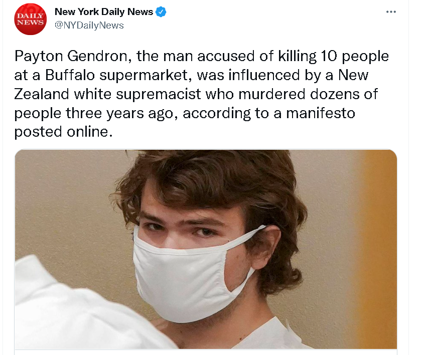 对此,“纽约每日新闻”网站的一篇报道透露,在作案前,根德伦疑似在网上发布了一份180页的作案行动计划书,其中他不仅大谈特谈自己的“白人至上主义”极端思想,还提到他此次作案是受到2019年在新西兰基督城的清真寺里屠杀了51人的澳大利亚白人恐怖主义分子布兰顿·塔兰特(Brenton Tarrant)的影响。