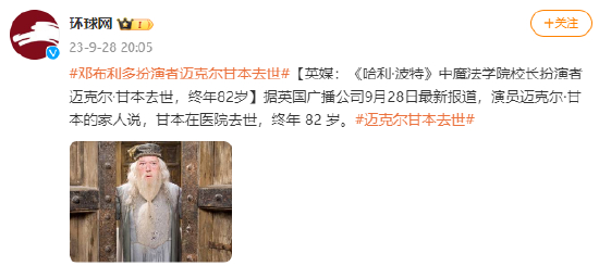 #邓布利多扮演者迈克尔甘本去世#[英媒:《哈利·波特》中魔法学院校长扮演者迈克尔·甘本去世,终年82岁]据英国广播公司9月28日最新报道,演员迈克尔·甘本的家人说,甘本在医院去世,终年 82 岁。#迈克尔甘本去世#