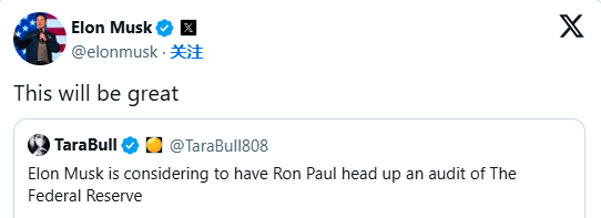 马斯克周日还回应了另一位X用户的帖子,该用户表示马斯克正在考虑任命89岁的前国会议员罗恩·保罗(Ron Paul)领导对美联储的审计。马斯克表示,“这将会很棒。”