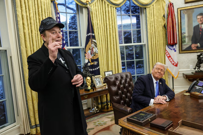 当地时间2月11日,美国华盛顿白宫椭圆形办公室内,美国总统特朗普坐在办公桌后,而被任命为政府效率部(DOGE)负责人的特斯拉CEO马斯克站在他的右侧,为政府效率部的活动阐述了大约30分钟的理由,并回答记者提问。这是马斯克担任该职务后首次直接面对媒体并回答问题。