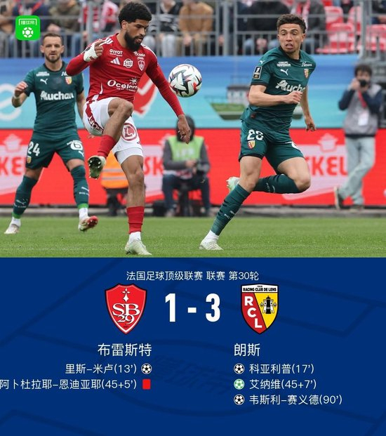 北京时间4月20日,法国足球顶级联赛第30轮,布雷斯特主场迎战朗斯。比赛中,布雷斯特由里斯-米卢率先取得进球。随后,朗斯的科亚利普迅速扳平比分。上半场结束前,布雷斯特的阿卜杜拉耶-恩迪亚耶被红牌罚下,朗斯获得点球机会,艾纳维主罚命中反超比分。比赛尾声阶段,韦斯利-赛义德为朗斯再入一球锁定胜局。最终,布雷斯特1-3不敌朗斯。