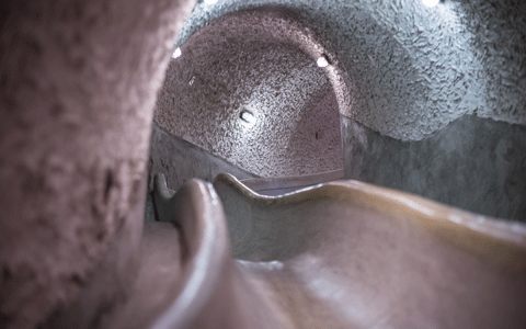 这条溜滑梯约一人宽,初滑时并不觉得速度很快,直到过了第一个弯道,速度加快。滑梯的尾部,高出地面十几公分,人滑到底部可以自然站立。再往前就是平坦的水泥地,深入往前走,则有一扇紧闭金属门,打开就是出口。据了解,如果乘坐溜滑梯,最快五分钟就可以离开圆山饭店。