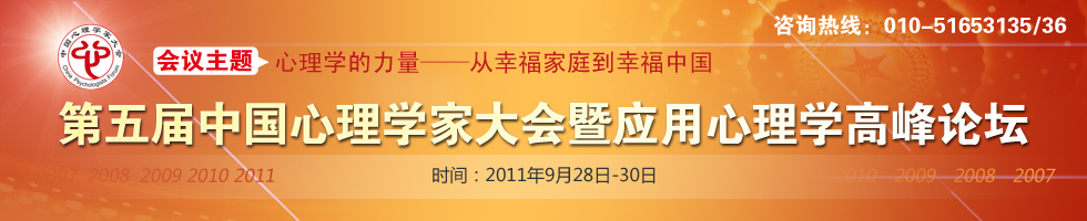 专题摘要:“第五届中国心理学家大会暨应用心理学高峰论坛”定于2011年9月28-30日在北京隆重举行,本届大会主题为:“心理学的力量——从幸福家庭到幸福中国”。[详细] [滚动] [评论]