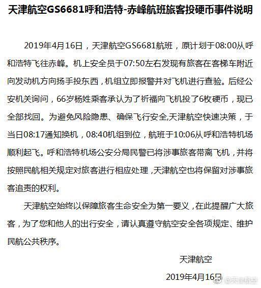 2019年4月16日,天津肮空GS6681航班,原计划于08:00从呼 和洁特飞往赤峰。机上安全员于07:50左右发现有旅客在客梯车附近向发动机方向扬手投东西,机组立即报警并对飞机进行查验。后经公安机关询问,66岁杨姓乘客承认为了祈福向飞机投了6枚硬币,现已 全部找回。为避免风险隐患、确保飞行安全,天津航空快速决策,于当日08:17通知换机,08:40机组到位,航班于10:06从呼和浩特机场顺利起飞。呼和浩特机场公安分局民警已将涉事旅客帯离机场,并将按照民肮相关规定对旅客进行相应处理,天津航空也将保留对涉事旅 客追责的权利。