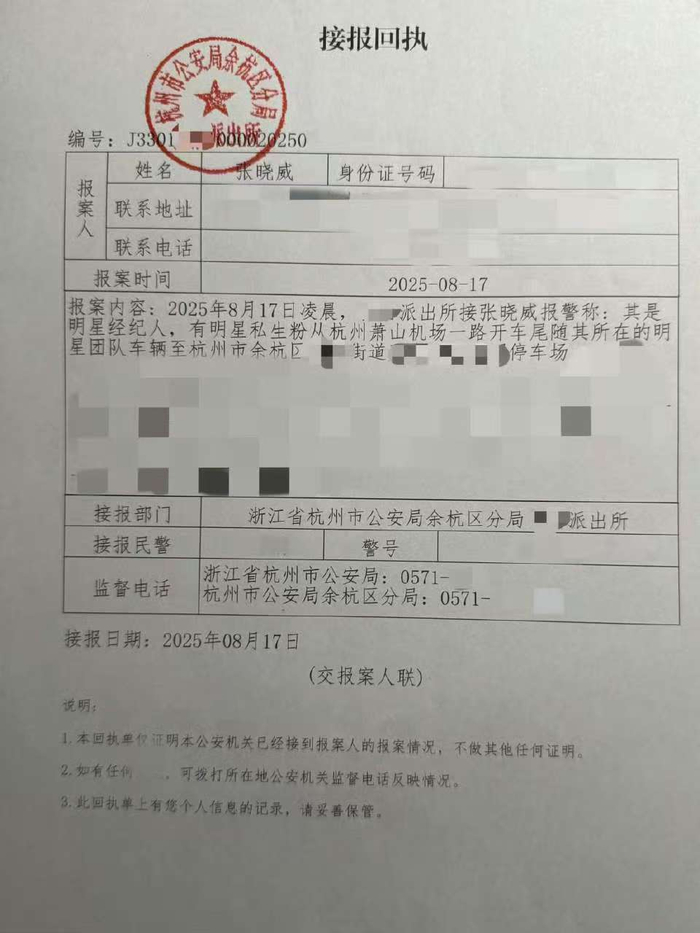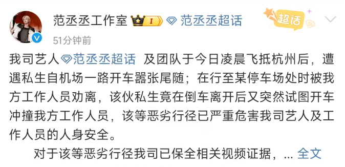 我司艺人范丞丞及团队于今日凌晨飞抵杭州后,遭遇私生自机场一路开车嚣张尾随;在行至某停车场处时被我方工作人员劝离,该伙私生竟在倒车离开后又突然试图开车冲撞我方工作人员,该等恶劣行径已严重危害我司艺人及工作人员的人身安全。