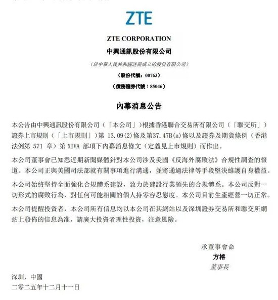 中兴通讯在公告中表示,公司始终坚持全面强化合规体系建设,致力于建设行业领先的合规体系。反对一切形式的腐败行为,对任何可能相关的个人持零容忍态度。