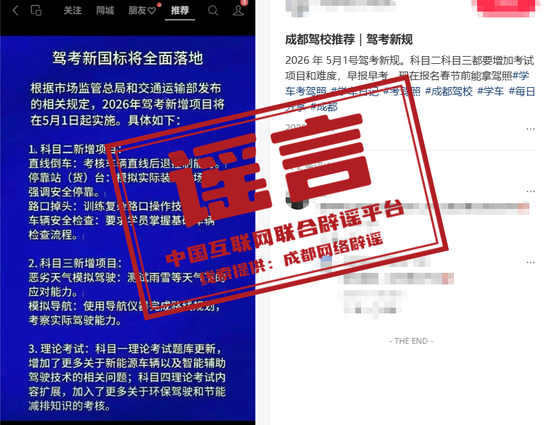 详情:近日,有网传消息称,C2驾照科目二考试将于2026年5月1日起新增考试项目。针对该传言,成都交管部门在回应网友咨询时明确表示:截至目前,未接到相关主管部门关于 C2科目二新增考试项目的正式通知与部署安排,网传相关信息均非官方发布。所谓“新增直线倒车、停靠站台、路口掉头、车辆安全检查”等内容,多为驾培行业训练建议或不实传言,并非法定考试项目。(来源:“成都网络辟谣”微信公众号)