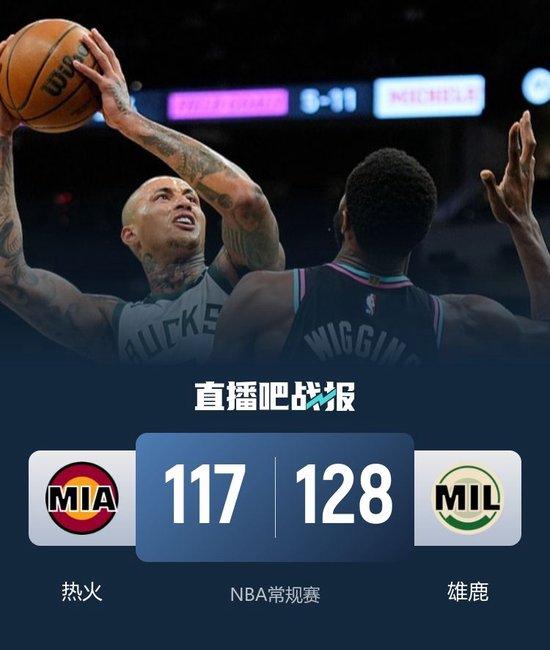 比赛开始,两队开场便陷入缠斗,比分始终紧咬,库兹马高效输出,热火内外开花给出回应,次节两队依旧打得难解难分,鲍威尔和维金斯相继外线开火,小凯文·波特得分助攻一肩挑还以颜色,雄鹿一波7-0以63-58领先结束上半场。易边再战,雄鹿命中率下降,热火多点开花反超比分,末节热火占得先机扩大优势,雄鹿奋力反击回敬11-1的攻击波强势反超,双方争夺陷入白热化,关键时刻小凯文·波特3+1引领球队10-0的攻击波锁定胜局。最终,雄鹿128-117扑灭热火,主场过关。