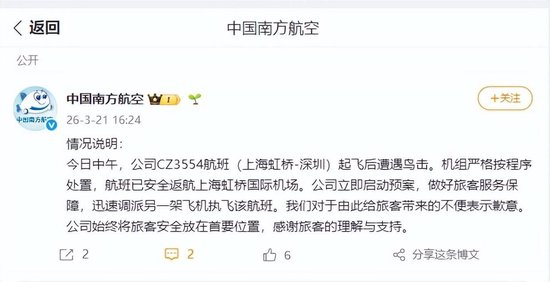 今日中午,公司CZ3554航班(上海虹桥-深圳)起飞后遭遇鸟击。机组严格按程序处置,航班已安全返航上海虹桥国际机场。公司立即启动预案,做好旅客服务保障,迅速调派另一架飞机执飞该航班。我们对于由此给旅客带来的不便表示歉意。公司始终将旅客安全放在首要位置,感谢旅客的理解与支持。