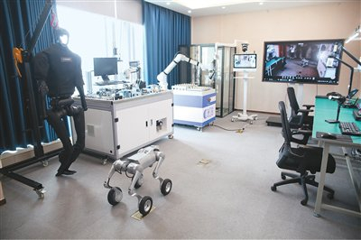 机器人实验室里陈列着人形机器人、机械臂、AI实验台和监控屏幕等设备,宠智灵在这里开展机器人协同作业测试以及宠物情绪行为检测等研究。