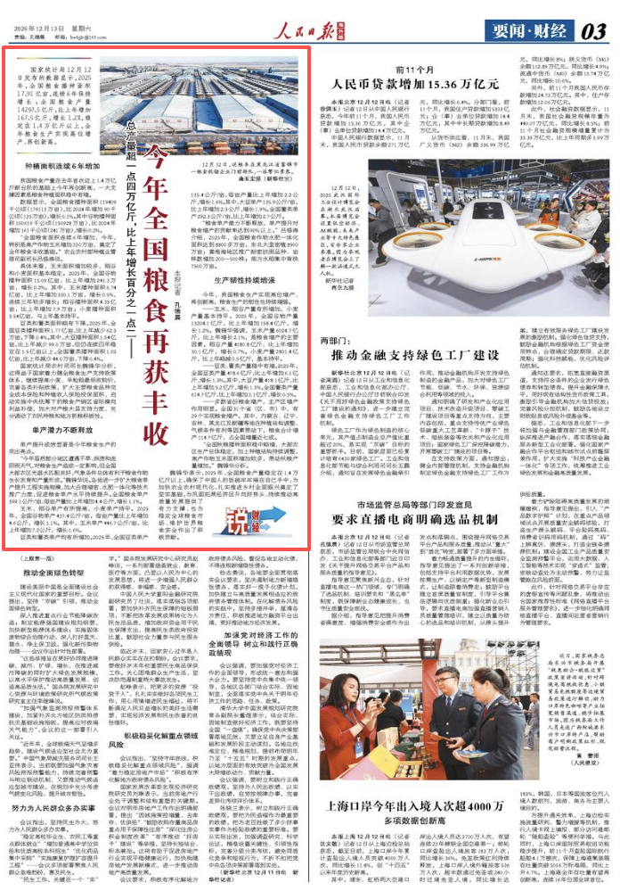 国家统计局12月12日发布的数据显示,2025年,全国粮食播种面积17.91亿亩,连续6年保持增长;全国粮食产量14297.5亿斤,比上年增加167.5亿斤,增长1.2%,稳定在1.4万亿斤以上,全年粮食生产实现高位增产、再创新高。